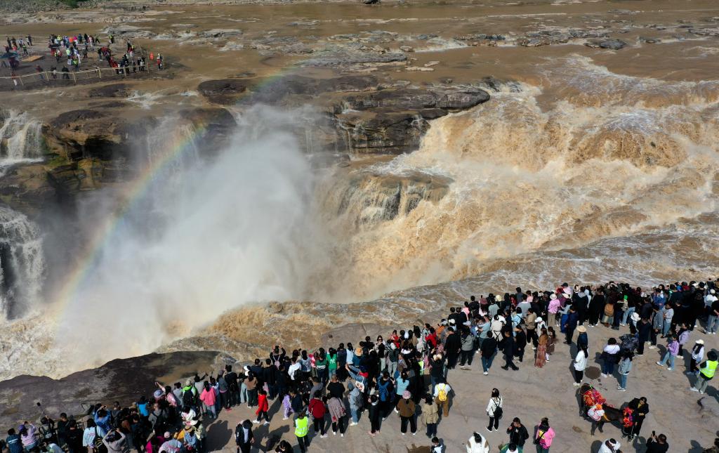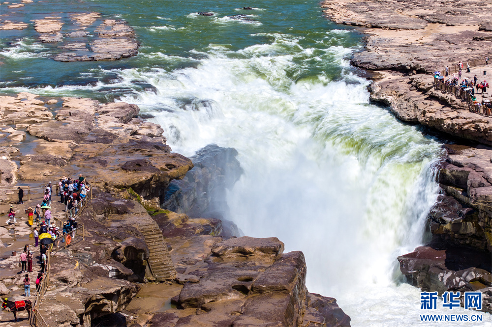 游客在“变色”后的黄河壶口瀑布观赏。 近日,由于黄河水位回落影响,位于秦晋峡谷段的水量减少,河水明显变清,十里龙槽水位下降,壶口瀑布落差加大,滔滔白浪飞流直下,溅起冲天水雾,壶口瀑布出现“青山绿水”景观,吸引了众多游客踏至观赏。 “五一”期间,为有效应对客流高峰,黄河壶口瀑布旅游区(陕西侧)将实行实名预约购票。每日最大接待上限3万人,游客可提前一至五天通发表于 2024-04-28 16:48黄河旅游