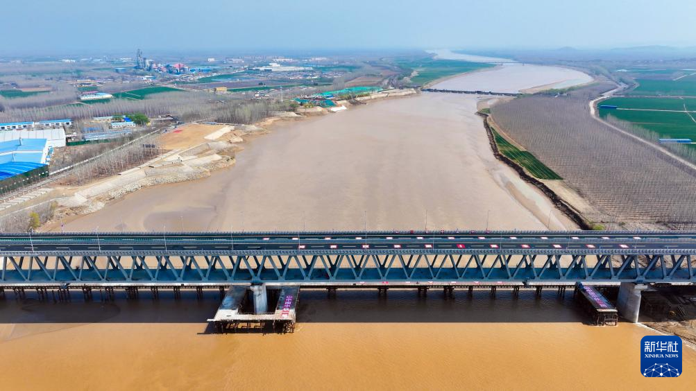 3月26日,车辆行驶在建邦聊(城)泰(安)黄河公铁大桥上(无人机照片)。