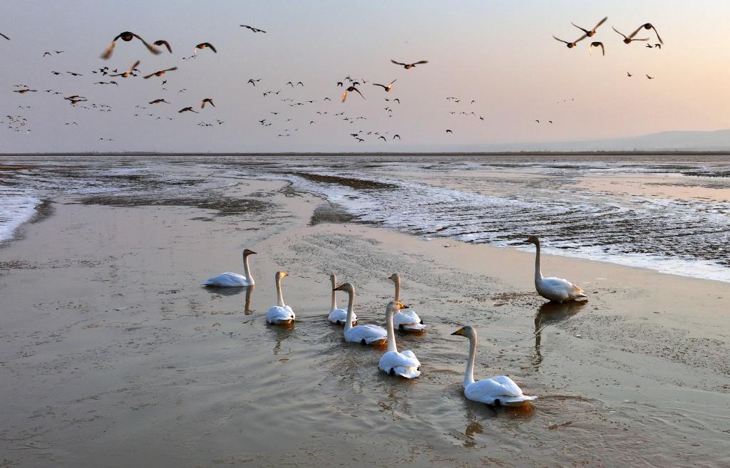 2月3日,一群天鹅在黄河湿地(无人机照片)。近日,黄河西岸的合阳黄河湿地自然保护区内,天鹅今年首次规模出现,数量近千只。合阳黄河湿地自然保护区位于陕西省合阳县。新华社发(崔正博 摄)